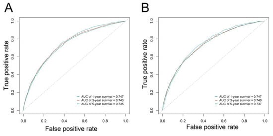 Receiver operating characteristic curve of the nomogram in the training (A) and validation (B) cohorts.