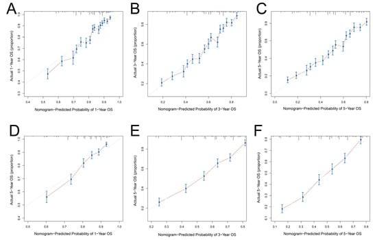 Calibration curves of the nomogram for predicting overall survival: (A) at 1 year in the training cohort; (B) at 3 years in the training cohort; (C) at 5 years in the training cohort; (D) at 1 year in the validation cohort; (E) at 3 years in the validation cohort; (F) at 5 years in the validation cohort. OS: overall survival.