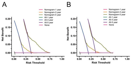 Decision curve analysis for the nomogram in the training (A) and validation (B) cohorts.