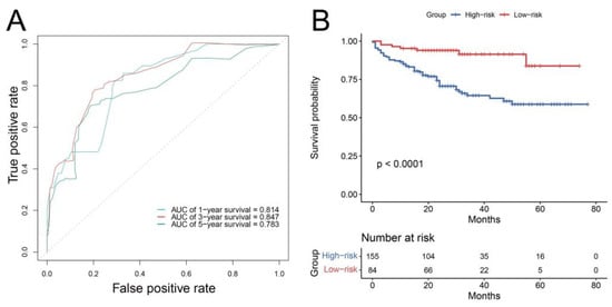 Receiver operating characteristic curve (A) and Kaplan–Meier curves of risk group (B) of the external validation cohort.