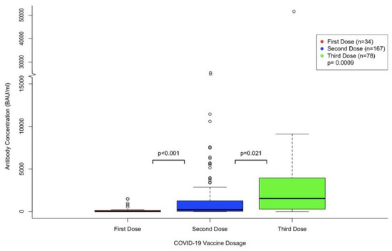 A one-way ANOVA test demonstrated a significant difference in antibody concentration levels amongst the different vaccine types for the first dose (p < 0.002). However, no significant difference was seen in antibody concentration levels amongst the different vaccine types for the second and third dose (second dose, p = 0.39; third dose, p = 0.18).
