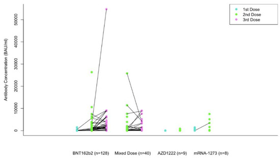 Figure 2 shows the change in antibody levels after receiving the first, second, and third dose of each participant’s respective vaccines. Each line is drawn from the antibody levels measured after the first dose, to the second, and then the third dose for the same participant. For all vaccine groups, 90.9% of participants demonstrated a higher second dose antibody concentration than the first dose, and 70.8% had a higher third dose antibody concentration compared to the second dose (i.e., 29.2% became lower on the third dose). In the BNT162b2 category, antibody concentration between the first and second dose increased by a factor of 9.3 on average, and 3.4 between the second and third dose. It should be noted that decreases in individual antibody concentration were also observed between the second and third dose. 84.6% of participants who received the BNT162b2 vaccine demonstrated an increase in antibodies between the first and second dose, whereas 77.8% of participants demonstrated an increase in antibodies between the second and third dose. In the Mixed Dose category, antibody concentration increased by a factor of 1.03 on average, between the second and third dose. Additionally, 70.4% of participants demonstrated an increase in antibody concentration, while 29.6% demonstrated a decrease. In the mRNA-1273 category, the average antibody concentration between the first and second dose increased by a factor of 3.2, and 100% of participants who had results recorded for their first and second dose demonstrated an increase in antibody concentration. The cohort of AZD1222 vaccine had limited participants and no comparisons between doses could be made. Factors of increase were not provided in the last two categories due to a limited number of participants. An ANOVA was conducted to compare the first (125.5 BAU/mL), second (1169.3 BAU/mL), and third dose antibody concentrations (3918.9 BAU/mL) of the BNT162b2 group, which demonstrated a significant difference in antibody concentration between each group (p < 0.001). A T-test was conducted to compare the second (1839.7 BAU/mL) and third dose (1890.7 BAU/mL) average antibody concentrations from the Mixed Dose category, which demonstrated no significant difference between the antibody concentrations (p = 0.96). Due to a limited number of participants, no statistical analyses were performed for the AZD1222 or mRNA-1273 groups.