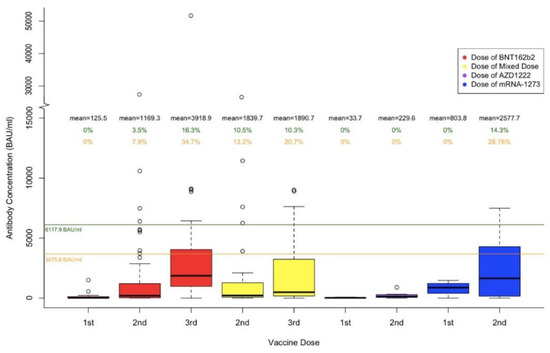 The upper green line of 6117.9 BAU/mL is the second highest antibody concentration prior to a known breakthrough infection (post 3rd dose, blood drawn 39 days prior to PCR confirmed infection). The lower orange line of 3675.6 BAU/mL is the average of antibody concentrations in eleven infections confirmed by PCR. The percentages shown in green represent the percentage of antibody concentration that is above 6117.9 BAU/mL per each dose of each vaccine type. The percentages shown in orange represent the percentage of antibody concentration that is above 3675.6 BAU/mL per each dose of each vaccine type.