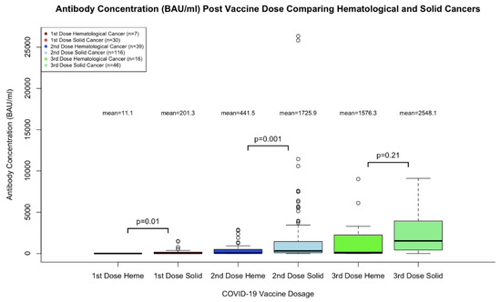 Figure 4 demonstrates the difference in antibody levels comparing those with hematological and solid cancer types for each dose of the SARS- CoV-2 vaccine. The mean antibody level in BAU/mL is shown for each category. A Welch’s two sample t-test was run to compare the antibody levels between those with solid and hematological cancers for each vaccine dose. A significant difference was found when comparing the first dose antibody levels between solid and hematological cancers (11.1 vs. 201.4 BAU/mL, respectively, p = 0.01). A significant difference was found when comparing the second dose antibody levels between solid and hematological cancers (441.5 vs. 1725.9 BAU/mL, p = 0.001). There was not a significant difference found when comparing the third dose antibody levels between solid and hematological cancers (p = 0.21).