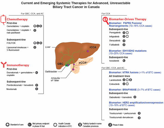 - Cowzer, D.; Harding, J.J. Advanced Bile Duct Cancers: A Focused Review on Current and Emerging Systemic Treatments. Cancers 2022, 14, 1800. [Google Scholar] [CrossRef]