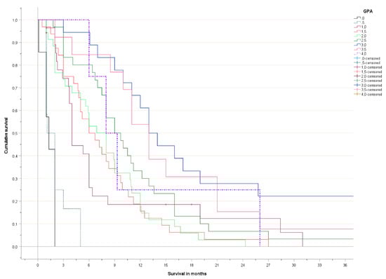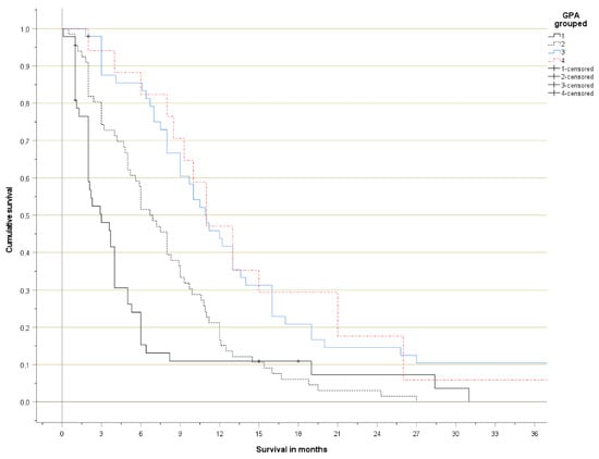 The GPA point sum as continuous variable (0–4 points) was significantly associated with survival (Cox regression p < 0.001). Table 3 displays the number of patients per GPA stratum and group, and their survival outcomes.