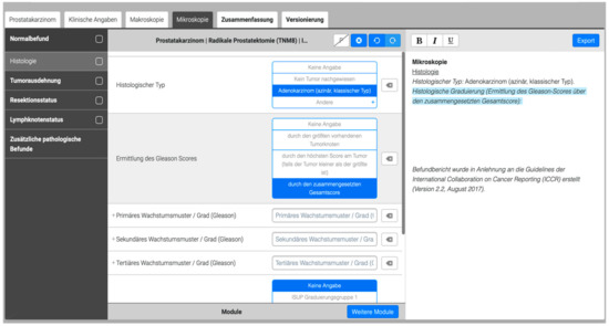 Prostate cancer is one of the most common malignant tumors and accounts for 25% of all new cancer cases in male patients in Germany [1]. Pathological examination and reporting following radical prostatectomy play a major role in case management. Excellent evidence-based templates for radical prostatectomy specimens have been published by interdisciplinary experts of leading professional societies, including the International Collaboration on Cancer Reporting (ICCR) [2,3,4], and the advantages of introducing a standardized reporting in pathology have been highlighted for different tumor types in several studies [5,6,7,8,9,10,11]. As shown in a recently published study by Fronhoffs et al., a uniform reporting structure and the consistent diction of findings are of great importance for clinicians and aid in communication between pathologists and clinicians [12]. A recently published dataset from the Netherlands demonstrates that the use of standardized structured reporting results in improved patient care and prognosis of patients with colorectal cancer [13]. Given the increasing importance of machine learning and artificial intelligence (AI) in diagnostics, oncology [14], and medicine in general, the establishment of fully structured reports using electronic tools yielding large datasets is of particular interest [15,16]. The clinical relevance of AI is highlighted by the first ever United States Food and Drug Administration (FDA) approval for an AI-based pathology tool to detect prostate cancer received by Paige Inc. in 2021 [17]. Despite the obvious advantages in patient care, interdisciplinary communication, high importance for precision medicine [18], and structured data as the first step towards digitized pathology, most pathological reports are currently still written as narrative free-text reports (narrative reports/NR), thus reflecting the individual structure and diction of the pathologist in charge.