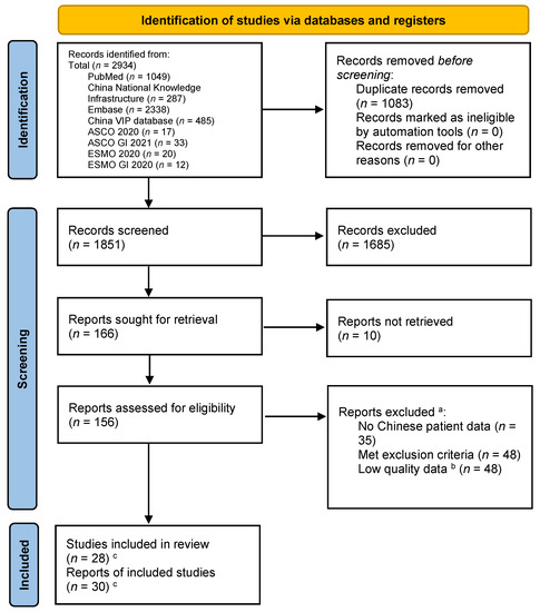 The searches of the PubMed, Embase, CNKI, VIP, ASCO 2020, ASCO GI 2021, ESMO 2020, and ESMO GI 2020 databases returned a total of 2934 records (Figure 1). Of these, 1083 records were duplicates and were removed before screening. Of the remaining 1851 records screened, 1685 records were discarded after assessing the titles and abstracts for inclusion (Figure 1). The full-text articles of the remaining 166 citations were sought for retrieval for a detailed evaluation, and 156 full-text reports (including congress abstracts) could be retrieved. Of these, 35 lacked extractable Chinese patient subgroup data, 48 met the exclusion criteria upon detailed evaluation, and 48 were excluded due to a serious risk of bias. Finally, 30 reports were included in the systematic review, including 5 that were added during the writing of this review (Table 4). No further studies were identified by screening the references of the included articles.