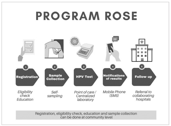 Overview of Program ROSE. Step 1–2 can be conducted in different settings such as primary healthcare facilities or in the community: Eligibility check, education and self-sample collection. Step 3: HPV testing can be point of care or in a centralized laboratory. Step 4: Results are delivered via SMS within a pre-determined time frame and Step 5: Participants with a positive screen will be supported by a dedicated program staff and linked to care.