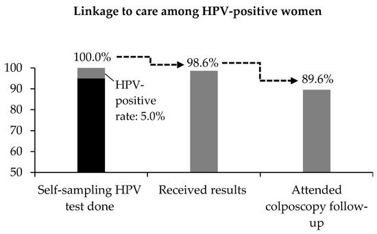 Linkage to care among women who were screened positive for self-sampling HPV test under Pilot Project ROSE. A total of 4188 women were screened and 99.7% had a valid HPV test result. The positive rate was 5.0%. Almost 99% of HPV-positive women confirmed receipt of test results and 89.6% attended colposcopy follow-up.