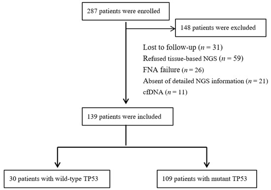 The study retrospectively reviewed 287 patients with advanced lung cancer at our Oncology Department between December 2019 and January 2022. The exclusion criteria were as follows: lost to follow-up (n = 31), refused tissue-based next-generation sequencing (NGS) (n = 59), failed fine-needle aspiration (FNA) biopsy for routinely screened of molecular alterations (n = 26), absence of detailed NGS information (n = 21), and evaluating mutational status with blood-cell-free DNA (cfDNA) (n = 11). Finally, a total of 109 patients with wild-type TP53 or mutant TP53 reported on NGS panels met the inclusion criteria in the present study (Figure 1). The study was reviewed and approved by the Ethics Committee of our department.