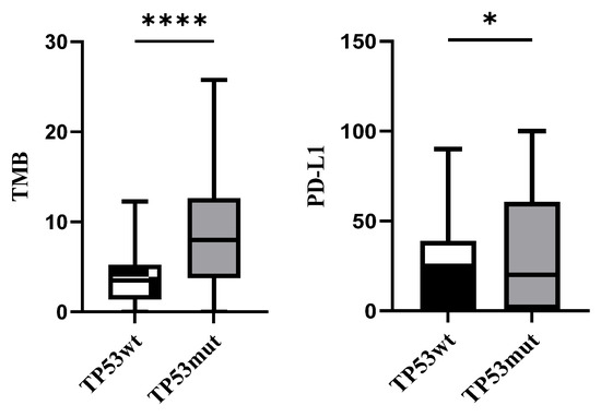 TMB and PD-L1 levels in TP53wt and TP53mut cohorts (* p < 0.1, **** p < 0.0001).
