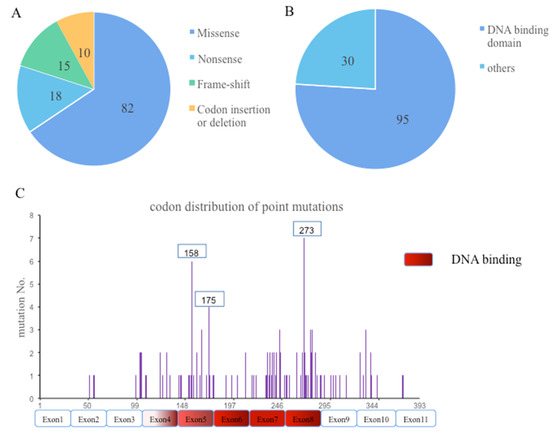 “Technical” types (A), cluster of domains (B), and codon distribution (C) of TP53 mutation in 109 patients.