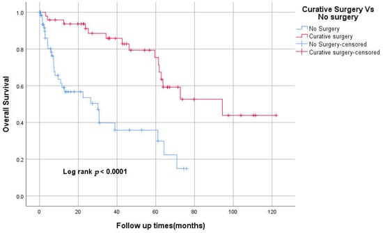Kaplan–Meier curve of Overall survival for curative surgery vs. no surgery.