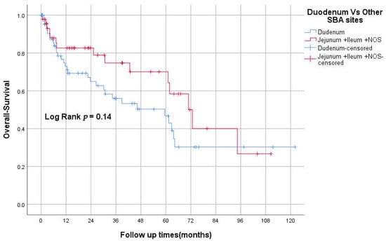Kaplan–Meier curve of OS for duodenum vs. other SBA sites.