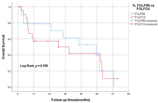 Nineteen patients received FOLFIRI as an initial treatment, while 23 received FOLFOX. The median OS for the FOLFIRI group was 59 months (95% CI 24–94) vs. 30 months (95% CI 0–70) for the FOLFOX group. The Kaplan–Meier method did not show any statistically significant difference between the two groups in overall survival (log-rank test. P = 0.705; Figure 5).