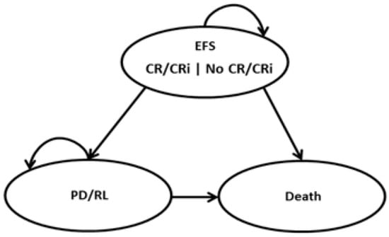 Partitioned survival model structure. EFS: Event-free survival, CR/CRi: complete remission/complete remission with incomplete blood count recovery, and PD/RL: progressive/relapsed disease.