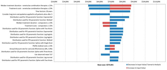 According to the DSA, the ICURs of Ven+Aza compared with Aza varied between $54,896/QALY and $92,659/QALY from an MoH perspective and between $41,324/QALY and $79,087/QALY from a societal perspective. The parameters with the greatest impact on the base-case ICURs from both MoH and societal perspectives were: (i) the median treatment duration of Ven+Aza, (ii) the treatment cost of Ven+Aza, (iii) the 10-year time horizon, and (iv) the consideration of long-term extrapolation applied to all patients alive after 5 years (Figure 2).
