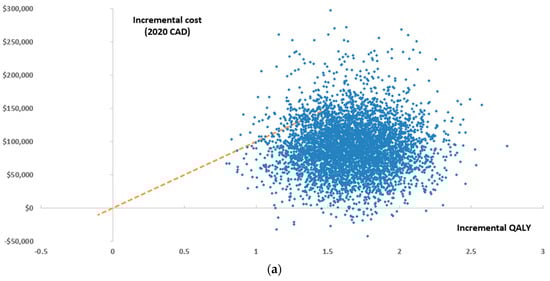 Results of the probabilistic sensitivity analysis from an MoH perspective presented as a (a) scatter plot and (b) cost-effectiveness acceptability curve, QALY: quality-adjusted life year.