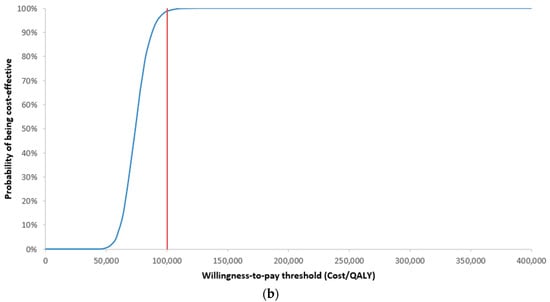 Both deterministic and probabilistic analyses were performed for this economic evaluation to assess the impact of the variation of each parameter on the base-case results. The robustness of the base-case results was assessed through deterministic sensitivity analyses (DSA). This was performed by varying each single variable individually within the lower and upper bounds of all key parameters. For this analysis, model parameters were varied using standard errors, standard deviations, or 95% confidence intervals (CIs), when available, and a range of ±25% for other parameters. A probabilistic sensitivity analysis (PSA) was also performed to assess the overall impact of uncertainty associated with study parameters. Simultaneous variations in all key parameters were performed using Monte Carlo simulations. A total of 5000 Monte Carlo simulations were performed using appropriate distributions (beta distribution bounded by 0 and 1 for probabilities and utility values, and gamma distribution for disutilities, treatment duration, and cost parameters). Results of the PSA were presented as cost-effectiveness acceptability curves and the probability of being cost-effective at a threshold of $100,000/QALY was estimated [].