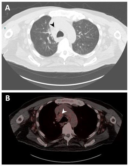 Imaging studies. (A) Computerized tomography (CT) scan of the chest showing right lower paratracheal lymphadenopathy measuring 2.1 cm (black arrow). (B) Gallium-68 dotatate positron emission tomography (PET)/CT scan of the chest demonstrating right lower paratracheal lymphadenopathy with mild radiotracer uptake, suggesting a neoplastic process related to mantle cell lymphoma (white arrow).