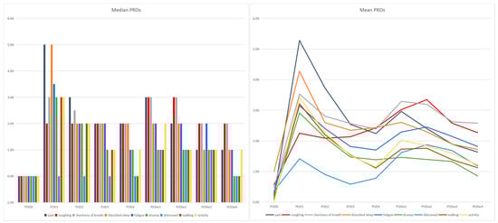 The median and mean values of each PRO score (pain, coughing, shortness of breath, disturbed sleep, fatigue, drowsy, distressed, activity, walking) at each data collection time point.