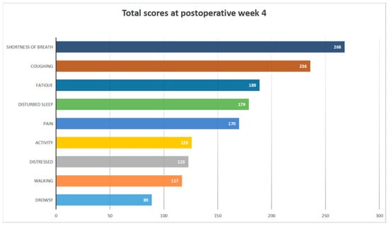 We calculated the median and mean values of each PRO score (pain, coughing, shortness of breath, disturbed sleep, fatigue, drowsiness, distress, activity, and walking) at each data collection time point, as shown in Figure 1. The graphs show the changes in each PRO score with time postoperatively. The PRO scores rose and fell after discharge, and most PROs failed to return to their preoperative baseline levels in the fourth postoperative week, both at the median and mean values. The two highest-scoring PRO items in week 4 after surgery were “shortness of breath” (median 2, mean 2.58) and “coughing” (median 2, mean 2.27). To make the results of the fourth week more intuitive, we summed the scores of the 104 patients under each item at week 4 after surgery, as shown in Figure 2, and we discovered that “shortness of breath” and “coughing” had the highest overall scores.