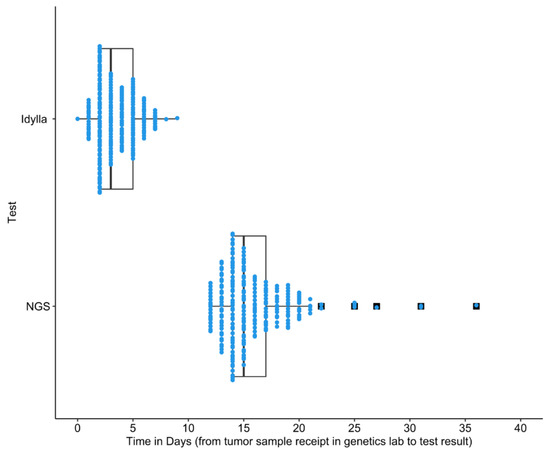 Comparison of laboratory TAT between the Idylla EGFR and Oncopanel NGS in patients who received concurrent Idylla and Oncopanel testing (N = 235). Each blue dot represents an individual at a certain time-point. Boxplots visualize median, two hinges (25% and 75% quantiles), and two whiskers (95% CI). Black squares indicate outliers. The difference in means was −12.4 days (p < 0.0001, 95% CI: [−12.8, −11.9] days). The mean lab TATs are 15.8 and 3.4 days for the Oncopanel and Idylla EGFR test, respectively.