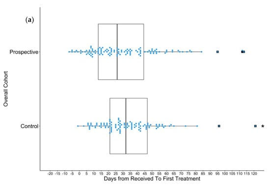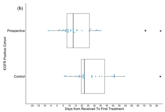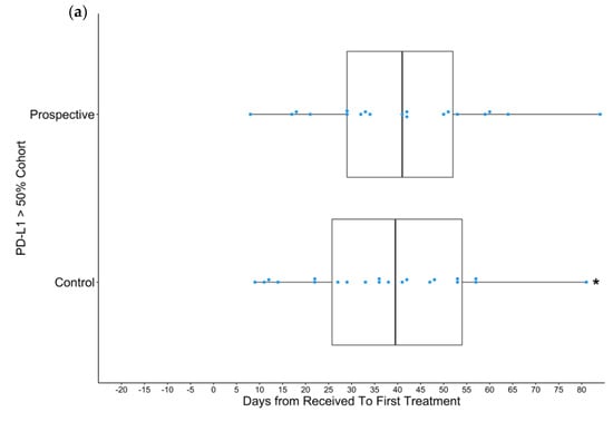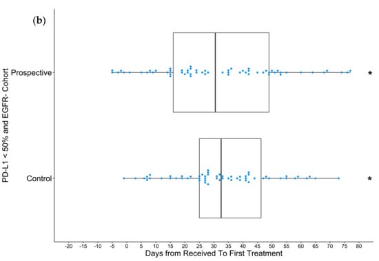 Figure 1 includes all data points. The data ranges of the results presented in Figure 2 and Figure 3 were limited to improve clarity for comparison of distributions. As a result, outliers were excluded. From the overall control group, eight patients were excluded because their TTT exceeded 120 days (Figure 2a). Two patients in the control EGFR+ control group and one in the prospective EGFR+ group exceeded 80 days and were excluded (Figure 2b). Three patients in the control PD-L1 ≥ 50% group were excluded from because they exceeded a TTT of 80 days (Figure 3a). Four patients in the control non-PD-L1 ≥ 50%, non-EGFR+ group and two patients in the prospective PD-L1 < 50% and EGFR-group exceeded 80 days and were excluded.