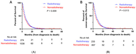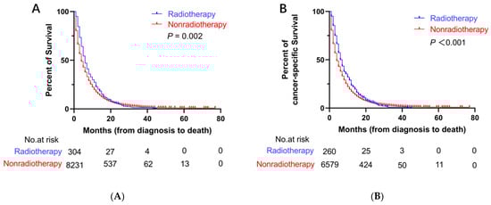 Before PSM, the median OS (mOS) and median CSS (mCSS) in the radiotherapy group were 6 months (95% CI: 5.3–6.7 months) and 6 months (95% CI: 5.1–6.9 months), respectively. The mean survival period was longer in the radiotherapy group than that in the nonradiotherapy group (mOS = 4 months, 95% CI: 3.8–4.2 months; mCSS = 4 months, 95% CI: 3.8–4.2 months) (Figure 2). After PSM, the mOS (6 months, 95% CI: 5.2–6.8 months) and mCSS (6 months, 95% CI: 5.0–7.0 months) in the radiotherapy group were longer than the mOS (4 months, 95% CI: 3.6–4.4 months) and mCSS (5 months, 95% CI: 4.5–5.5 months) in the nonradiotherapy group (Figure 3).