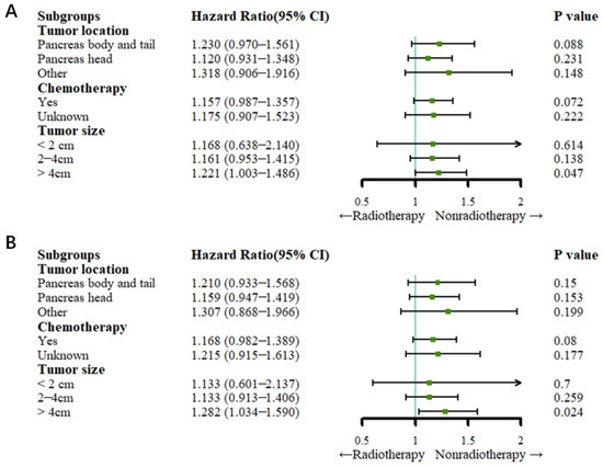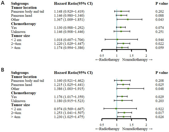 Before PSM, the Cox regression analysis showed that the patients in the nonradiotherapy group with pancreatic head cancer had a higher cancer-specific mortality rate (HR: 1.215, 95% CI: 1.025–1.441; p = 0.025) but not a higher all-cause mortality rate than the patients in the radiotherapy group (HR: 1.146, 95% CI: 0.980–1.340; p = 0.088). Compared with no radiotherapy, radiotherapy did not reduce the all-cause mortality rate or the cancer-specific mortality rate among patients with pancreatic body and tail cancer (all p > 0.05). Among the patients who underwent chemotherapy, those in the nonradiotherapy group had a higher cancer-specific mortality rate (HR: 1.176, 95% CI: 1.017–1.359; p = 0.029) but not a higher all-cause mortality rate than the patients in the radiotherapy group (HR: 1.130, 95% CI: 0.988–1.292; p = 0.074). Patients with a tumor size between 2 and 4 cm in the nonradiotherapy group had higher all-cause mortality (HR: 1.220, 95% CI: 1.029–1.447; p = 0.022) and cancer-specific mortality (HR: 1.253, 95% CI: 1.041–1.507; p = 0.017) rates than patients in the radiotherapy group. For patients in the nonradiotherapy group with a tumor size greater than 4 cm, the cancer-specific mortality rate (HR: 1.230, 95% CI: 1.025–1.475; p = 0.026) was higher than that of those in the radiotherapy group, but radiotherapy did not reduce the all-cause mortality rate compared to no radiotherapy (HR: 1.174, 95% CI: 0.994–1.386; p > 0.05) (Figure 4).
