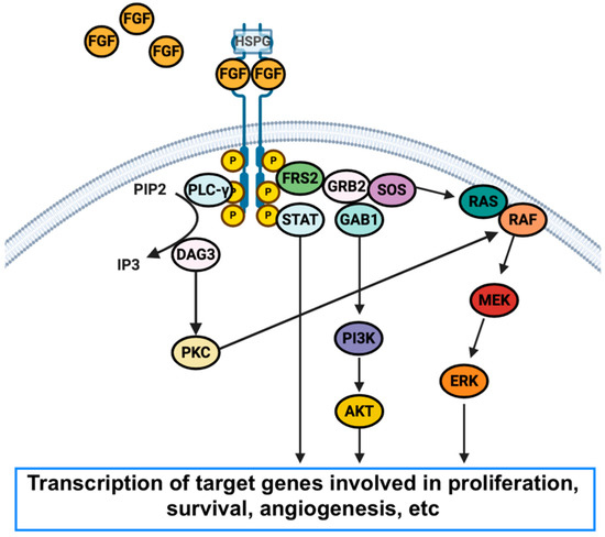 FGFRs are a family of receptor tyrosine kinases, which are located on the cell membrane; once these receptors are activated by fibroblast growth factor (FGF), this link leads to the dimerization of FGFRs, with subsequent autophosphorylation of the intracellular kinase domain and activation of downstream pathways (Figure 1) [24,25].