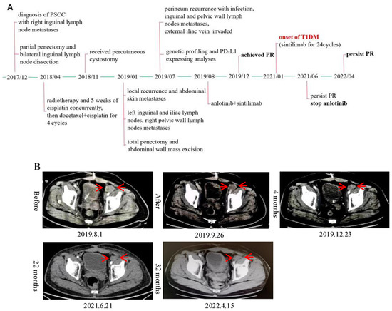 (A) Timeline of the patient’s therapy and the effects of therapy. Imaging showing metastasis of pelvic lymph nodes. (B) Contrast-enhanced abdominal computed tomography assessments of pelvic wall tumor nodule during each period. Red arrows indicate the tumors.