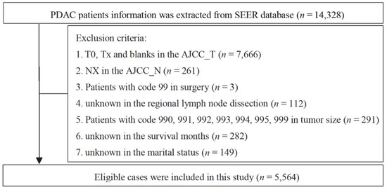 A retrospective cohort study was performed by extracting data from the SEER database, which is the authoritative cancer database in the United States, collecting cancer data from 18 population-based cancer registries in 14 states. “Incidence-SEER Research Plus Date, 13 Registries, November 2020 sub (2000–2018)” was employed as the data source. We selected cases through “Site code ICD-O-3/WHO 2008” and regarded “Pancreas” as the site of morbidity to determine the patient cohort of this study and extract patient-related information. Based on previous studies using the same database, we identified PDAC by the codes defined by “ICD-O-3 Hist/Behav, Malignant” including 8140 and 8500 [11] (8140: Adenocarcinoma, 8500: infiltrating duct carcinoma). Demographic and clinical data were extracted for every patient, including age, gender, race, primary site (defined encoding: C25.0: Head of pancreas, C25.1: Body of pancreas, C25.2: Tail of pancreas, C25.3: Pancreatic duct, C25.4: Islets of Langerhans, C25.7: Other specified parts of pancreas, C25.8: Overlapping lesion of pancreas, C25.9: Pancreas), tumor size, histologic grade, TNM stage (AJCC 7th edition), surgery, regional lymph node dissection, marital status, radiotherapy, chemotherapy and the survival data of the patients. Inclusion criteria were as follows: (1) age ≥ 18 years; (2) histologically confirmed disease; (3) definite distant metastasis status; (4) diagnosed in 2010–2015. The exclusion criteria were shown in Figure 1. Ultimately, 5564 PDAC patients were eligible for subsequent analysis. SEER*Stat software (version 8.3.9.2) was used to extract data. This study complies with the requirements of the Declaration of Helsinki. Since SEER data are publicly available, this study did not require approval from the institutional ethics committee and informed consent was waived.
