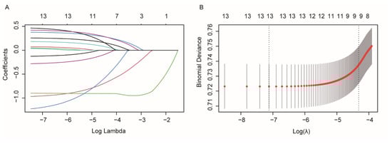 (A) The lasso regression is used to find the optimal lambda value. (B) Results of 10-fold cross-validation.