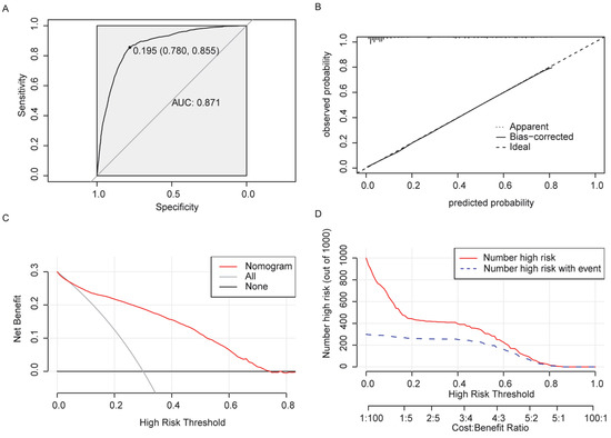 Nomogram was established according to the significant variables determined by multivariate logistic regression analysis (Figure 3). The HL test showed a p-value of 0.394 (greater than 0.05), indicating a good fit of the model. The ROC curve of the nomogram was constructed, and the results revealed that the AUC value of the model was 0.871, its cut-off value was 0.195, and the corresponding specificity and sensitivity were 0.780 and 0.855, indicating that this model had good predictive performance (Figure 4A). The C-index of the nomogram was 0.871 (95% CI 0.860–0.882), suggesting a good discriminatory ability of the model. We further employed the calibration curve to evaluate the agreement between the probability of occurrence of events predicted by the model and the actual probability of occurrence of events using the bootstrap method 1000 times (Figure 4B). Finally, we plotted DCA and clinical influence curves to observe the clinical utility of the model. DCA indicated that the nomogram had a wide threshold probability range and a positive net return (Figure 4C). In the clinical impact curve (Figure 4D), the red curve represents the number of people classified as positive by the model at each threshold probability and the blue curve represents the number of true positive people at each threshold probability, showing that with the increase of threshold probability, the accuracy of the prediction model for distant metastasis of PDAC was closer to the true value.