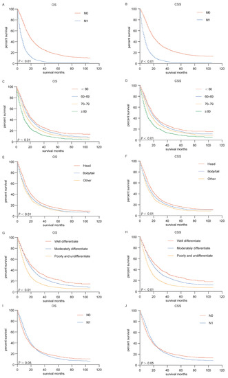 Survival analysis was performed according to the situation of distant metastasis and different independent risk factors. The Kaplan–Meier curves of CSS and OS were shown in Figure 5. Median OS was 18 and 6 months and median CSS was 19 and 6 months in PDAC patients without and with distant metastases, respectively, with statistically significant differences between groups (Figure 5A,B; p < 0.01). Comparison of different age subgroups showed that advanced age reduced the survival of patients with PDAC. The median survival for both OS and CSS was 9 months in patients with PDAC aged 80 years or older, and in the age group below 60 years, the median survival for both OS and CSS was 18 months (Figure 5C,D). There was no significant difference in the survival of patients with PDAC originating from different sites of the pancreas (Figure 5E,F). Figure 5G,H showed that the survival of patients with well differentiated PDAC was significantly better than those with poorly differentiated and undifferentiated PDAC, with median OS of 20 and 11 months and median CSS of 22 and 11 months, respectively (p < 0.01). In addition, there was no statistically significant difference in survival between PADC patients with and without lymph node metastasis (Figure 5I,J).