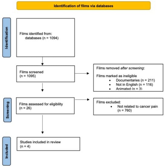 A qualitative content analysis was performed. First, a list of films was compiled that featured characters with cancer pain or its management independently by two reviewers who searched through the International Movie Database (IMDb) (https://www.imdb.com, 16 July 2020), the Literature Arts Medicine Database (https://medhum.med.nyu.edu/about, 16 July 2020), the History of Medicine and Medical Humanities Databases (https://medhumanities.mcmaster.ca/index/mcmaster-library-collections/resources-themes-bibliogrpahies/history-of-medicine-and-medical-humanities-database, 16 July 2020), and Medicine on Screen (https://medicineonscreen.nlm.nih.gov/category/all/, 16 July 2020). The IMDb is considered a validated tool to search for films for research purposes [,,,,]. The following keyword search terms were used: “pain” and “cancer”. These terms were purposefully kept broad to increase the probability that any relevant films were found. The databases were queried for films between January 1989 and January 2020. Rather than reviewing an “exhaustive” list of films that make any reference to cancer pain, the aim followed that described by Flores to consider representative films [] (p. 657).