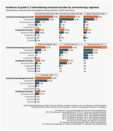 Few observational studies have investigated chemotherapy-induced adverse effects and factors associated with the severity of toxicities in breast cancer chemotherapy, including anthracycline-, taxane-, and non-anthracycline-based regimens. A 2014 population-based study evaluated the rates of first hospitalization (i.e., interpreted as severe levels) for eight reasons, including neutropenia, infection, fever, thrombocytopenia, anemia, dehydration, delirium, and other adverse effects of chemotherapy that occurred within six months of chemotherapy initiation among 3567 breast cancer patients older than 65 from the SEER/Texas Cancer Registry-Medicare database, and 9327 patients younger than 65 from the MarketScan database, diagnosed with stages I–IV breast cancer from 2003–2007 [29]. The study reported that among patients younger than 65, the unplanned hospitalization rates ranged from 6.2% (dose-dense AC followed by paclitaxel) to 10.0% (TAC: docetaxel, doxorubicin, plus cyclophosphamide every three weeks); and around 6% of patients were hospitalized for neutropenia, fever, or infection. Among patients older than 65, the rate of those admitted to the hospital ranged from 12.7% (TC: docetaxel and cyclophosphamide every three weeks) to 24.2% (TAC); and 12.4% of patients were hospitalized for neutropenia, fever, or infection [29]. In addition, the study suggested the regimens TAC and AC followed by docetaxel every three weeks (AC-T) were associated with the highest risk of chemotherapy-related hospitalization compared with the TC regimen for all age groups [29]. Additionally, the benefits of prophylactic G-CSF in reducing chemotherapy-related hospitalization rates and improving the ability of elderly patients to complete all cycles of chemotherapy were seen in SEER-Medicare patients [30,31,32]. Studies have shown that Asians may experience a higher incidence and severity rate of hematological toxicity than Caucasians even with G-CSF use [33]. Specifically, breast cancer patients in Asia-Pacific regions receiving docetaxel-containing regimens (e.g., the regimens of TAC or TC) or dose-dense chemotherapy (dose-dense AC followed by docetaxel) had a high incidence of neutropenia (20–41%) [34,35].