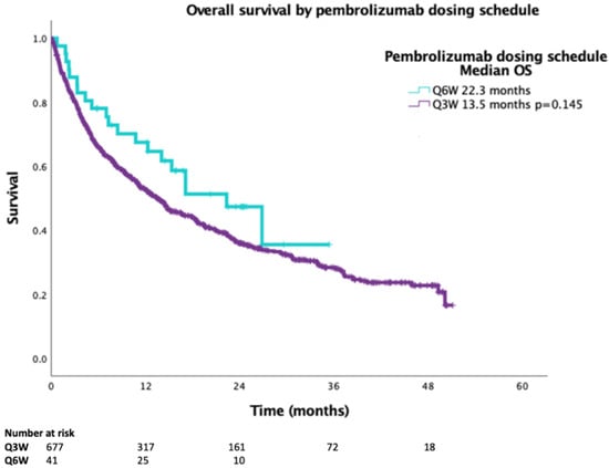 There have been retrospective studies assessing the real-world effects of extended dosing intervals of pembrolizumab in patients with NSCLC and PD-L1 ≥5 0%. The focus of these studies was to examine the safety and toxicity of a higher dose of pembrolizumab over a longer interval, and they have generally noted similar adverse event profiles [15,16,17,18]. Patient outcomes with respect to OS were evaluated in the Netherlands cohort; in the 54 patients who received single-agent immunotherapy, there was no statistically significant difference between single-agent pembrolizumab 200 mg given Q3W vs.400 mg Q6W, congruent with our results. Our study comprises the largest cohort to date that examines the different schedules for delivery of therapy.