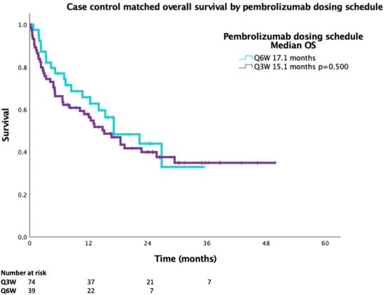 A 2:1 case-matched analysis was performed, controlling for sex, age ± years, PS and duration on pembrolizumab ± 2 months for Q3W vs.Q6W for OS (n = 113). Baseline characteristics of the case-matched cohort demonstrated no statistical difference between smoking status or histology (Table 3). The case-matched median OS for Q3W dosing was 15.1 months compared to 17.1 months for Q6W dosing, with a HR 0.834 (95%CI 0.490–1.417, p = 0.500) (Figure 2).