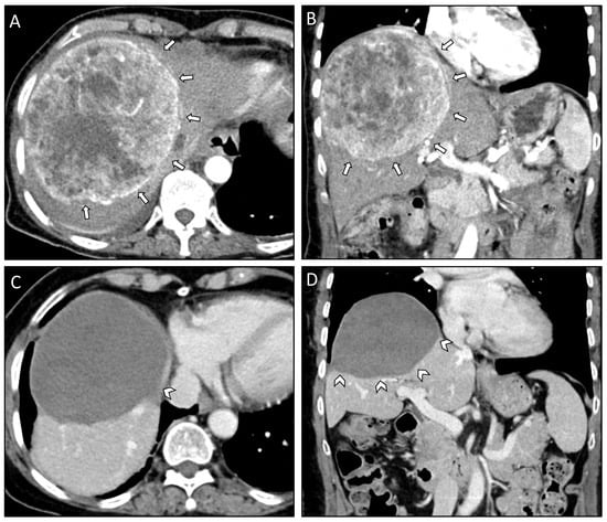 Axial (A) and coronal plane (B) of the pre-interventional CT scan of case #1 depicting a 13 cm measuring SFT/HPC in the right liver lobe (white arrows). Corresponding axial (C) and coronal plane (D) of the last follow-up CT scan 36 months after the initial diagnosis of liver metastasis and 11 months after the last SRFA session with progressively shrinking coagulation zone (white arrowheads).