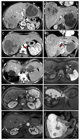 Axial (A) and coronal plane (B) of initial CT scans demonstrating very large SFT/HPC liver metastases in both right (white arrows) and left (white arrowheads) liver lobe. CT scan in axial (C) and coronal plane (D) after three TAE sessions revealing insufficient devascularization of the right liver lobe lesion anteriorly (white arrows). Note the beam hardening artifacts (red arrows) in the hepatic artery. Post-interventional CT scan (E) after first SRFA with laparoscopic liver packing (protection of cardio-esophageal region) showing coagulation zone (white arrowheads) with no residual vital tumor tissue visible. Contrast-enhanced MRI scan four months after first SRFA revealing a new metastasis in liver segment II (white arrows; (F)) and local recurrence in segment III following TAE (white arrowheads; (G)). MRI scan depicting three of six new liver lesions in segment IVa (white arrows; (H)) after resection of left lateral segments, all of them successfully treated with SRFA. MRI scans 15 months after the last intervention showing local recurrence at the resection margin (white arrows; (I)) and multiple new liver metastases (J).