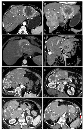 Axial (A) and coronal plane (B) of initial CT scans demonstrating multiple large SFT/HPC liver metastases affecting both right (white arrows) and left (white arrowheads) liver lobe. Axial (C) and coronal (D) plane of control CT scans following a total of six TAE sessions revealing mixed response with residual vital tumor tissue in liver segment II/III (white arrowheads; (D)). CT scans nine months after resection of left lateral segments revealing recurrent lesions in segments V, VI, VII (white arrowheads; (E,F)) and two new lesions in segments IVa and VII (white arrows; (E)). Successful treatment of recurrent lesions after a total of six SRFA and one additional TAE session as shown in the first follow-up CT scan after the last SRFA (white arrowheads; (G)). CT scan obtained following syncope 18 months after the last intervention revealing diffuse metastatic liver disease (white arrowheads; (H)), peritoneal metastases (white arrows; (H)), and ascites (red arrow; (H)) 18 months after the last intervention.