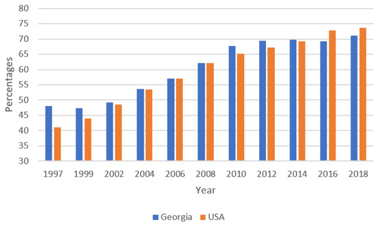 The 1997 to 2018 datasets from the Behavioral Risk Factor Surveillance System (BRFSS) were analyzed for this study. The BRFSS is a state-based survey of the noninstitutionalized U.S. adult civilian population [26,27]. It conducts more than 400,000 adult interviews each year through random-digit-dialed telephone survey and collects data on residents in all 50 states, the District of Columbia, and three USA territories regarding their health-related risk behaviors, chronic health conditions, and use of preventive services [26]. The state of Georgia has contributed to the system since it was established in 1984 [28]. The standards set by the American Association of Public Opinion Research (AAPOR) Response Rate Formula 4 [29] are utilized for calculating BRFSS response rates. In 2018, the survey response rates for all states, territories and Washington, D.C. ranged from 38.8% to 67.2% with a median of 49.9% [30]. For the present study, the 2018 data for Georgia was analyzed, and the combined response rate for cell phone and landline was 43.6 [30].