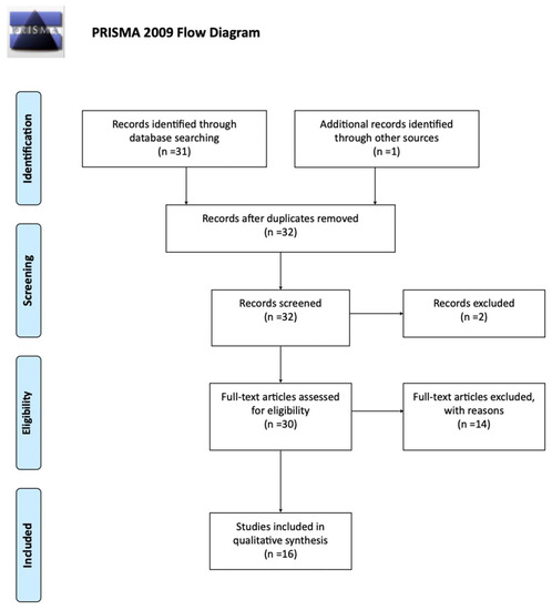 A total of 31 studies were returned from medical databases, according to our standardized search protocol. One additional study was added after manual search [17]. Thirty-two were screened for eligibility. One was excluded due to non-English language, one due to unavailability of full-text, and the remaining fourteen studies were deemed irrelevant after full-text screening. The PRISMA flow diagram is presented in Figure 1, and schematically describes the selection process and outcome. Finally, a total of 16 studies were included in the present analysis [10,17,18,19,20,21,22,23,24,25,26,27,28,29,30,31].