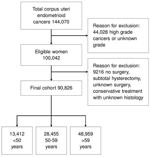We extracted all cases of corpus uteri endometrioid cancers with tumor grades of G1 or G2. We applied the following exclusion criteria: tumor grading G3 or unknown grading, primary tumor not treated with surgery, subtotal hysterectomy, unknown surgery, and conservative treatment with unknown histology. Patient selection is described in Figure 1.
