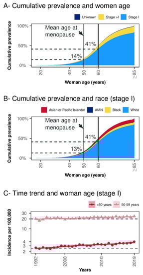 Cumulative women age prevalence and time-trends. Panel (A) Cumulative prevalence and women age-stratified per tumor stage. Panel (B) Cumulative prevalence and women age in tumor stage I stratified per race (cases with unknown race were excluded). Panel (C) Time trend in women below 50 and 50–59 years groups in SEER Research Data (12 Registries, Nov 2021 Sub, 1992–2019). Acronyms: AIAN = American Indian/Alaska Native.