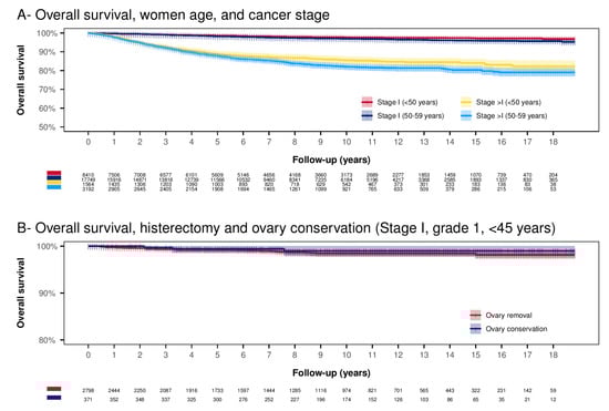Kaplan–Meier analysis. Panel (A) Overall survival according to age category and stage. The Log-rank test results statistically significant for all the paired comparisons. Almost all the differences have p < 0.001, except two cases: Stage I (<50 years) vs. Stage I (50–59 years) (p = 0.001) and Stage >I (<50 years) vs. Stage >I (50–59 years) (p = 0.038). Panel (B) Overall survival according to ovary conservation in stage I, tumor grading G1 below 45 years of age (uterus conservation is excluded). The Log-rank test results are not significant (p = 0.436).