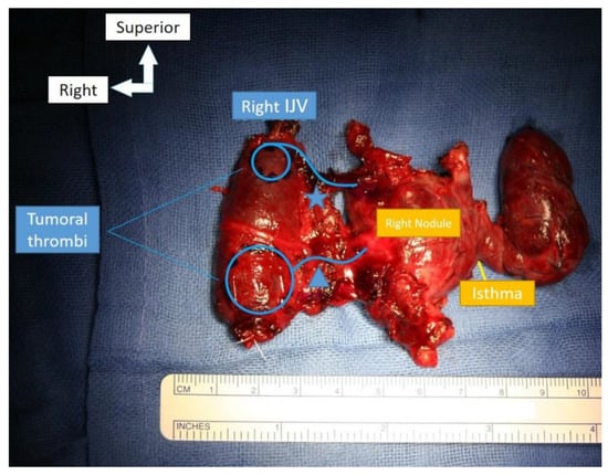 - Bhargav, P.R.K. Tumor thromboembolization into the internal jugular vein through its draining vein: A preoperative radiologic feature of high-risk thyroid cancer. Surgery 2014, 155, 196–197. [Google Scholar] [CrossRef] [PubMed]